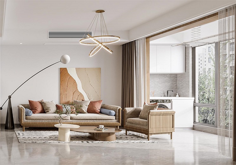 色彩相近、質感相異的電視背景墻與沙發,在對立統一中創造出一種自然的和諧。