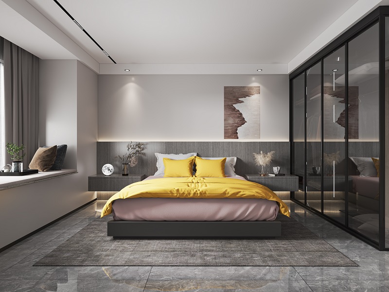 臥室采用灰色為主色調,點綴明黃色作為亮色在平靜的背景下,營造輕松、溫暖的氛圍。