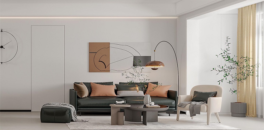 客廳區域精準拿捏線條、色塊比例。幾何形的燈具和茶幾消解了大面積色塊沉重感,展現出更為細膩的質感。